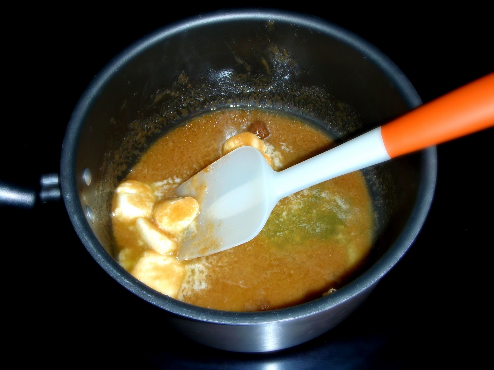 Melt Butter and Brown Sugar together until sugar is dissolved. Remove from heat and whisk in Vanilla (sorry no picture!) |